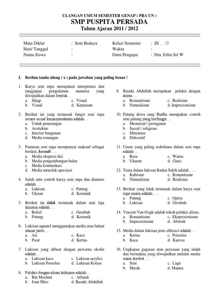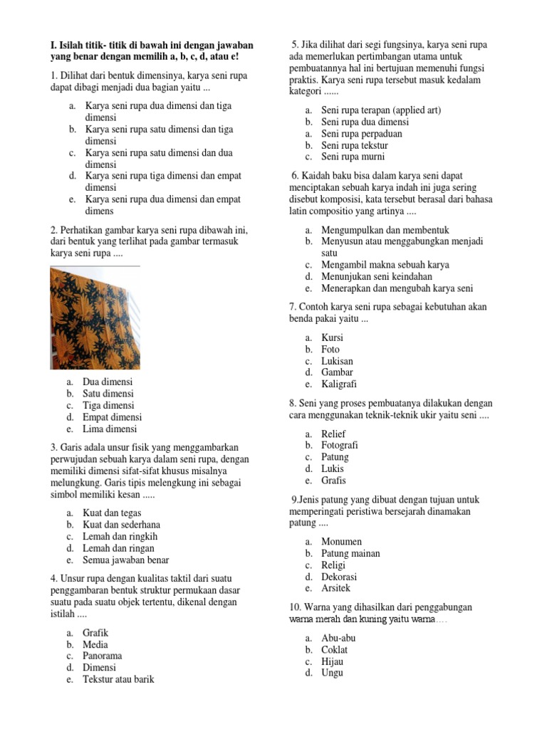 Seni rupa tiga dimensi adalah karya seni yang tidak hanya dibatasi oleh sisi panjang dan lebar, tetapi juga dibatasi oleh kedalaman atau tinggi. Patung, ukiran, seni kreografi e. Gambar seni rupa 2 dimensi berupa lukisan dan 3 dimensi berupa patung. Warna yang digunakan untuk membuat motif daun adalah … a.