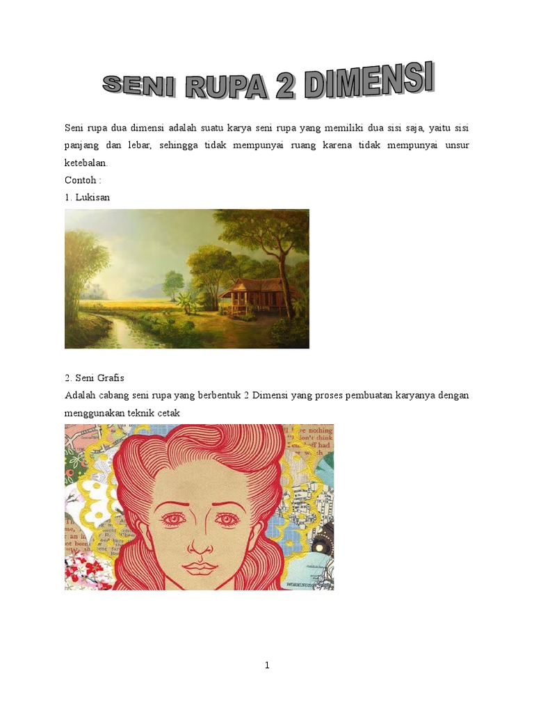 Contoh seni rupa 2 dimensi. Seni rupa 2 dimensi adalah karya seni rupa yang hanya memiliki dua ukuran atau sisi, mudahnya karya ini hanya memiliki panjang dan lebar saja, tanpa dimensi ketiga yaitu: Hasil karya seni 3 dimensi yang sangat terkenal yaitu patung. Kemajuan teknologi komputerisasi telah menghadirkan cabang seni rupa baru yang dikenal dengan seni desain grafis yang dianggap sebagai suatu representasi seni modern.