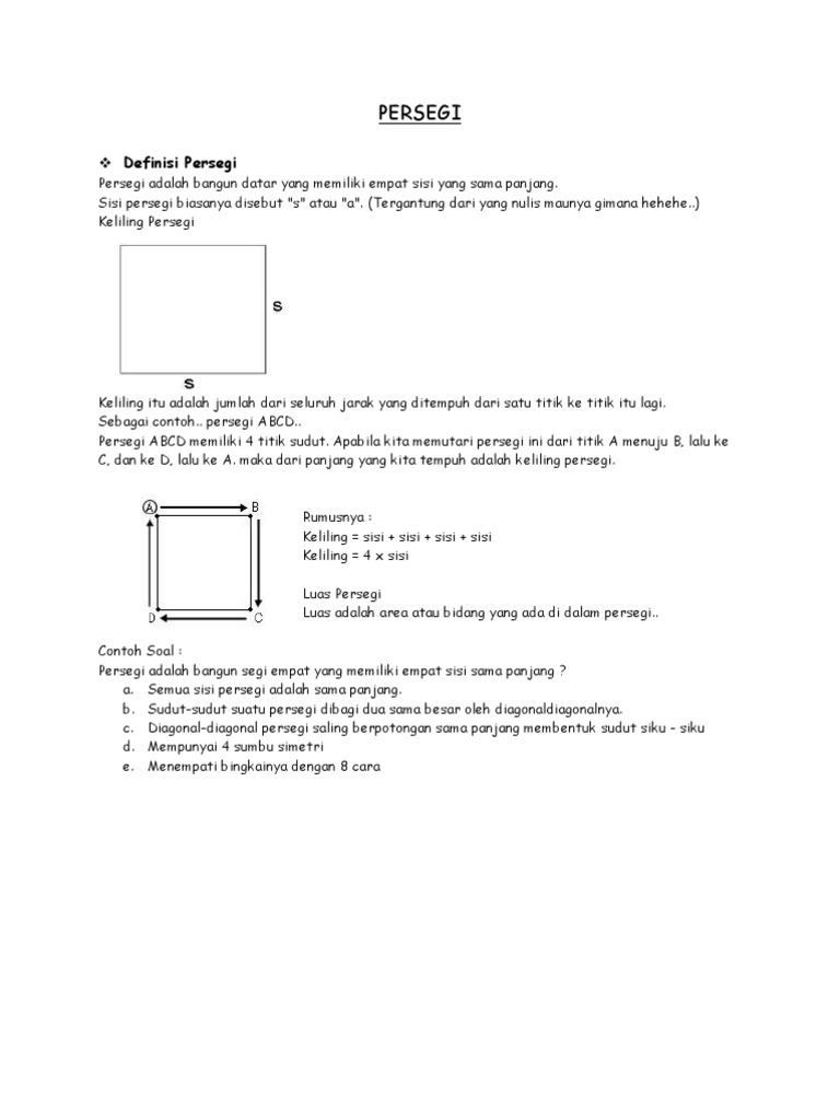 Sebuah persegi memiliki panjang sisi 6 cm. Bangun ruang sisi datar dan bangun ruang sisi lengkung. Yang termasuk dalam bangun ruang sisi datar yaitu kubus, balok, prisma, dan limas.