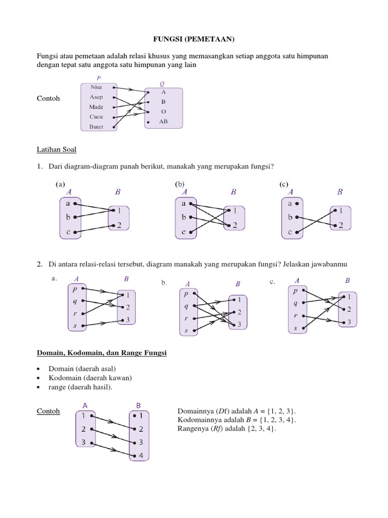 Karena terdapat anggota yang berbeda di himpunan a tetaou memiliki peta. Pemetaan/fungsi merupakan relasi khusus yang memasangkan setiap anggota himpunan a tepat sati dihimpunan b. Jawaban gambar diagram kartesius pada relasi. Contohnya fungsi f memetakan himpunan a ke himpunan b, maka dapat ditulis menjadi f(x) dimana.