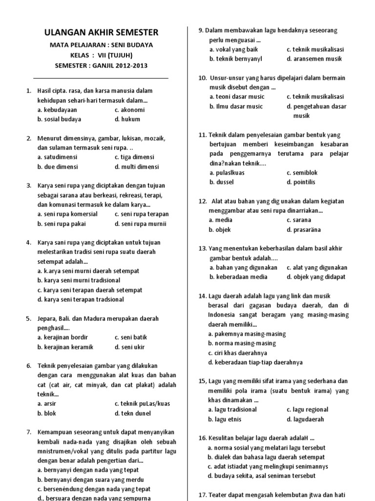 Berikut ini beberapa contoh seni rupa 2 dimensi dan 3 dimensi. Soal berisi pilihan ganda disertai kunci jawaban yang diblok tebal hitam dan soal essay / uraian juga berisi kunci jawaban. Tulis namamu di sudut kanan atas 2.
